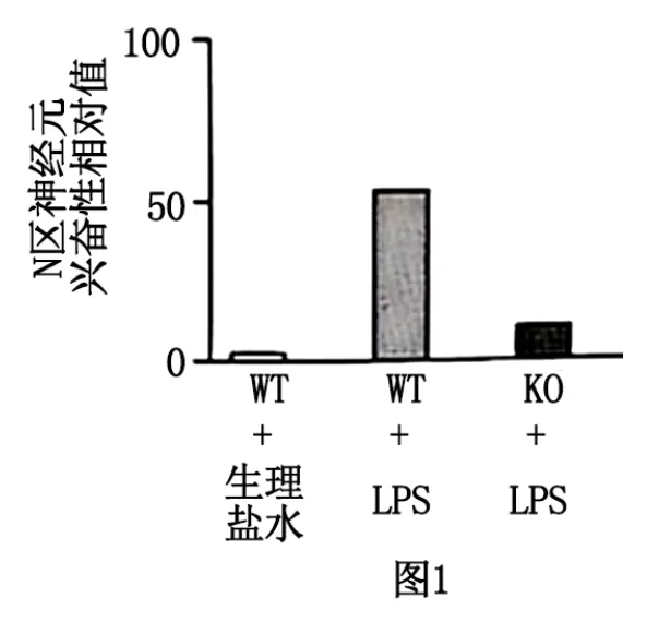此时若抑制小鼠脑干中的N区,会导致促炎因子IL-6显著增加、抗炎因子IL-10显著减少,说明N区抑制炎症反应;用LPS分别刺激野生型小鼠(WT)和免疫细胞上LPS受体缺失的小鼠(KO),发现KO组N区神经元兴奋性较弱,因此免疫细胞通过LPS受体接受LPS刺激。