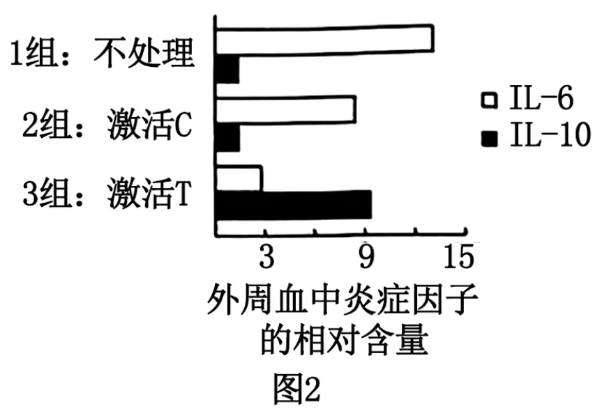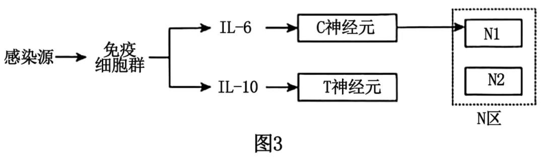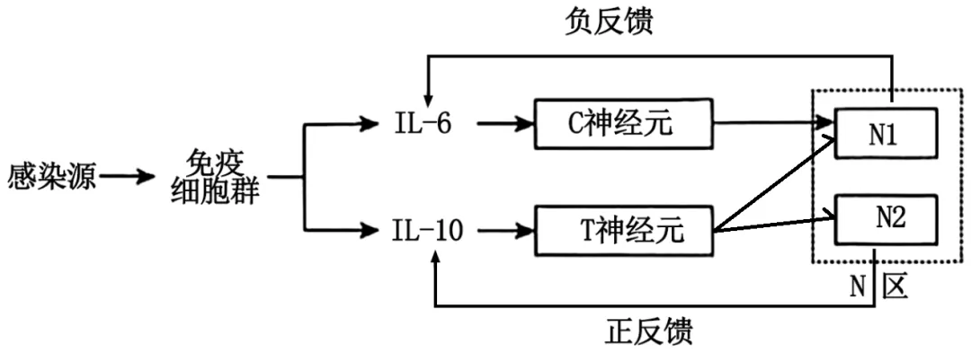②激活C仅导致L-6分泌量下降,IL-10分泌量不变,说明C与N1之间存在负反馈,而T导致IL-6分泌量显著下降,IL-10分泌量上升,说明T与N1之间存在负反馈,使得IL-6分泌量显著下降,而与N2之间存在正反馈,使得IL-10分泌量上升。