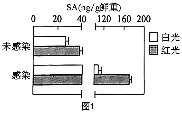 已知水杨酸(SA)可以抵御疫霉菌侵染,科研人员测定辣椒叶片中的SA含量,图中结果显示,感染和未感染时,红光处理组的SA含量均高于白光处理组,据此推测两种不同光处理后,辣椒感染程度不同的原因是红光处理组的SA含量高,因而有效抵御疫霉菌感染。