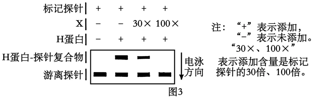 将不同组分混合保温后,电泳检测标记条带如图3。本实验的结果表明,H蛋白可直接结合P基因的启动子,又知探针是带有标记的,因此这里的启动不需要标记,因此,本实验中的X是(b)未标记的P基因启动子,实验结果表明,随着P基因启动子的含量增加,H蛋白的含量减少,因而可证明H蛋白直接结合P基因启动子,进而调控P基因的表达。