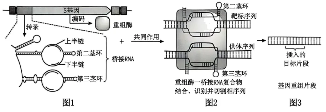 b.桥接RNA的第二、三茎环将靶标序列和供体序列结合在一起,重组酶可以识别并切割靶标序列和供体序列的特定部位,b错误;