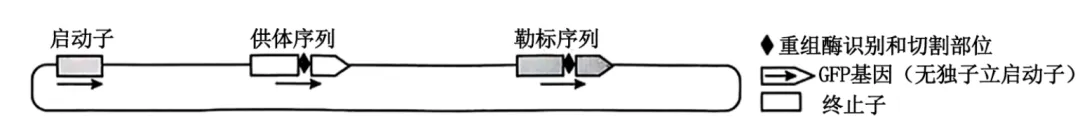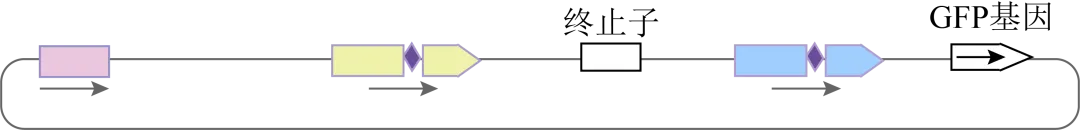 经重组酶-桥接RNA复合物处理可改变终止子的位置,使其从无荧光变为能发出绿色荧光,GFP基因和终止子的位置如下图所示。