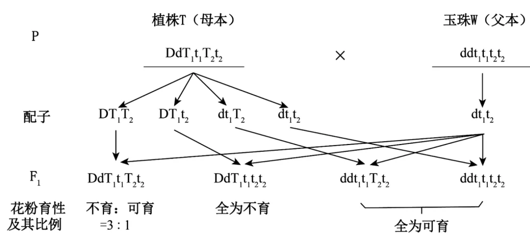 利用上述机制,用遗传图解分析植株T作为母本、玉米w作为父本的杂交过程如下,根据题意可知,植株T的基因型可表示为DdT1t1T2t2,玉米W的基因型为ddt1t1t2t2,相关遗传图解可表示如下:
