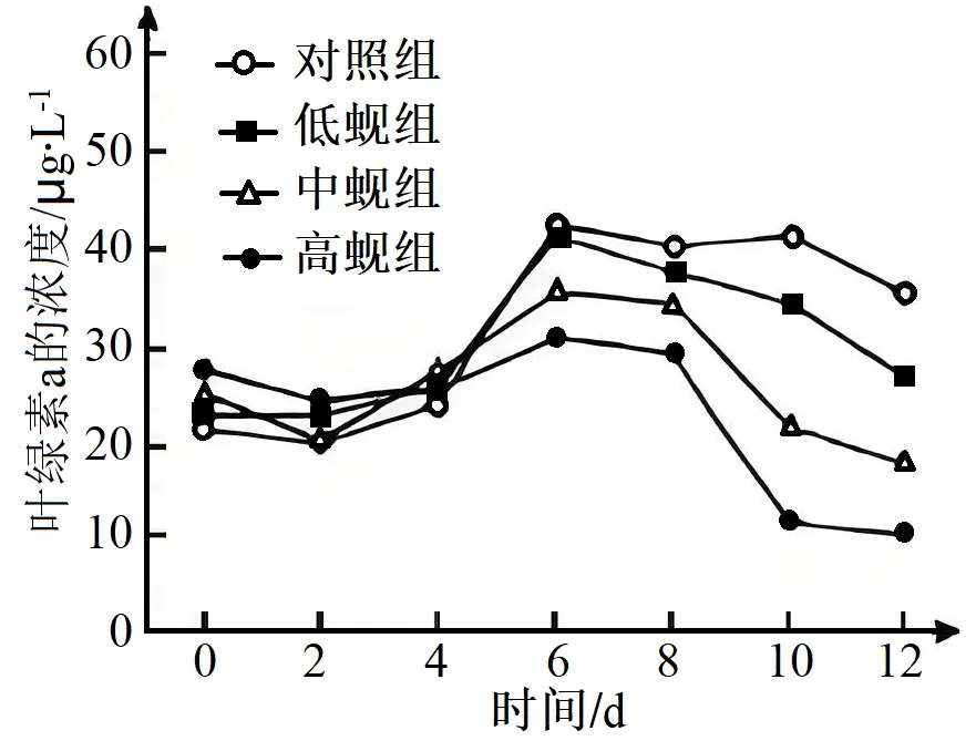 12. 河蚬是太湖大型底栖动物。为研究其对富营养水体水质的影响,在模拟太湖的水体中投放不同密度的河蚬,测得的浮游藻类含量(用叶绿素a的浓度表示)如图所示。相关叙述错误的是()