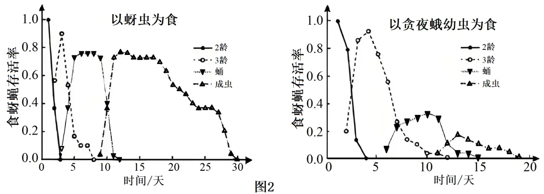结果表明,与以贪夜蛾幼虫为食相比,以蚜虫为食食蚜蝇的存活时间较长可达到30天,且无论以哪种蚜虫的状态为食,食蚜蝇的存活率均可以较高,而以贪夜蛾幼虫为食,且在以贪夜蛾蛹和成虫为食时,存活率较低,其存活时间不到20天,因而对食蚜蝇种群繁衍更有利。