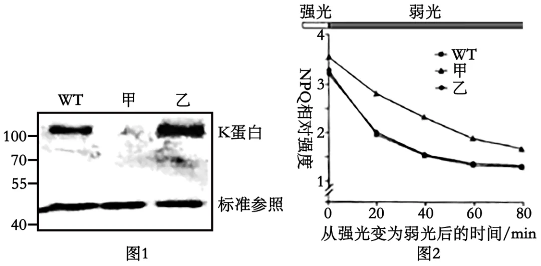 检测目的基因表达情况,是否翻译成蛋白质,可通过抗原−抗体杂交技术来检测。根据图2曲线变化可知K蛋白的功能是在强光转为弱光时,使拟南芥NPQ快速降低。