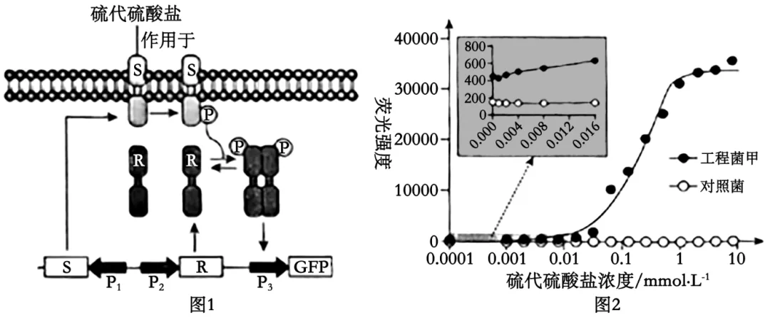 甲置于不同浓度的硫代硫酸盐溶液中,荧光检测结果如图2,即在硫代硫酸盐低浓度范围内即出现荧光,强度随其浓度的增加而增强,灵敏度高,因此工程菌甲可用于肠炎患者肠道内产生的硫代硫酸盐的含量测定,进而推测患者的肠炎情况。
