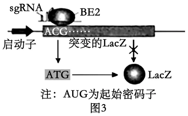 ①根据题意, BE2基因编辑系统中的BE2蛋白可在sgRNA引导下,将特定DNA序列中C定向编辑为T,根据图示,突变的LacZ基因ACG被BE2蛋白定向编辑为ATG,进而在翻译时翻译为AUG,因此与被编辑前相比,该方法使LacZ基因表达过程中的翻译能正常进行,从而可通过检测菌落颜色对炎症情况进行诊断。