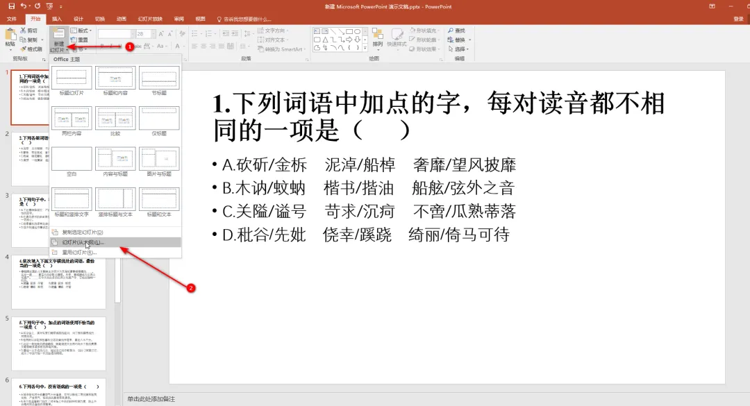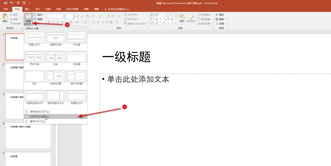 2.1 点击“新建幻灯片”,在下拉列表中选择“幻灯片(从大纲)”