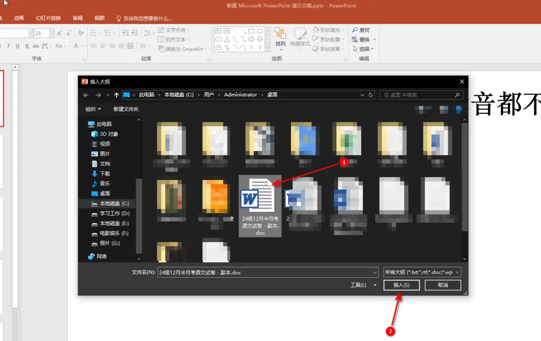 2. 写好后关闭word文档,然后还是从ppt中导入