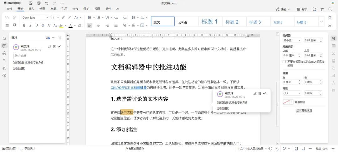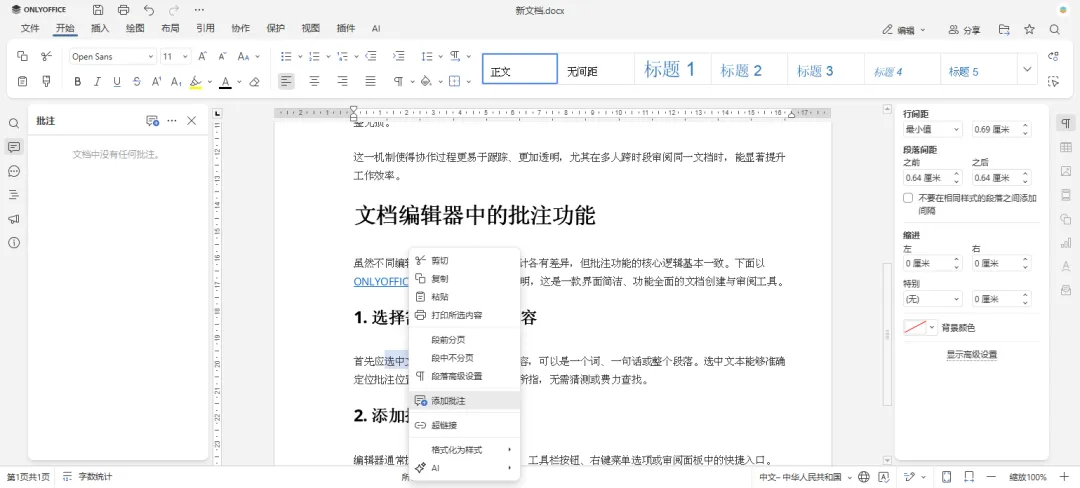 虽然不同编辑器的界面布局和按钮设计各有差异,但批注功能的核心逻辑基本一致。下面以 ONLYOFFICE 文档编辑器为例进行说明,这是一款界面简洁、功能全面的文档创建与审阅工具。