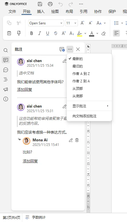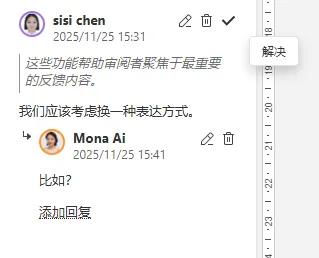 批注往往不是对话的终点。其他人可以回复批注、请求澄清或确认修改内容。多数编辑器会将相关讨论自动归类至同一主题下,确保界面整洁有序。这样既保留了完整的讨论脉络,又避免了信息分散。