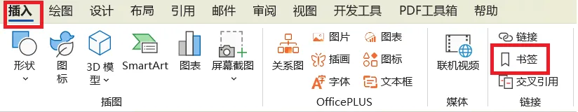 打开任意一个Word文档,“书签”在工具栏中位置如下图所示