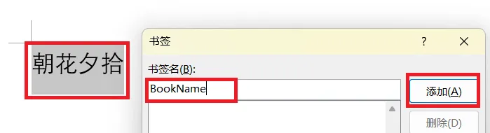 将光标移动到需要标记的文本位置,或选中一段特定的文本范围即可插入标签。例如,选中文字“朝花夕拾”添加了一个名为“BookName”的书签