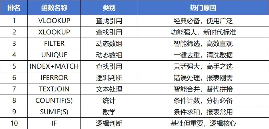别担心,今天给大家介绍deepseek整理的十大最常被搜索的Excel函数,看看哪个是你还在网上查询的?