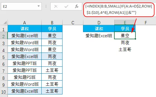相对于使用函数VLOOKUP来说,使用万金油公式INDEX+SMALL+IF+ROW要简单的多,这也是人见人爱的套路公式。