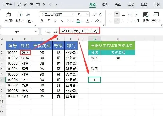 上面的公式表示,G3“张飞”在查找区域B2:B10里面去查找,数字0表示精确查找,它的结果1,也就是说G3“张飞”所在查找区域B2:B10是第一行。
