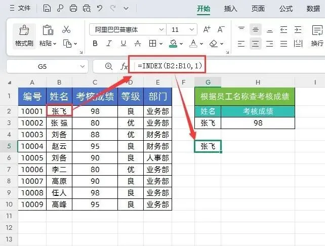 上面公式首先通过MATCH(G2,B2:B10,0)获取查询值所在行号,然后再通过嵌套INDEX函数去数组结果列里面,找对应这个行的值。
