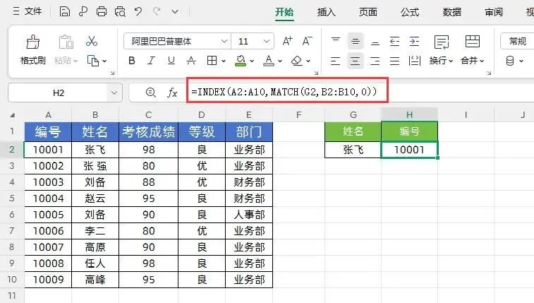 如下图所示,左侧是员工考核成绩表,右侧根据员工“姓名”查找对应的员工“编号”。