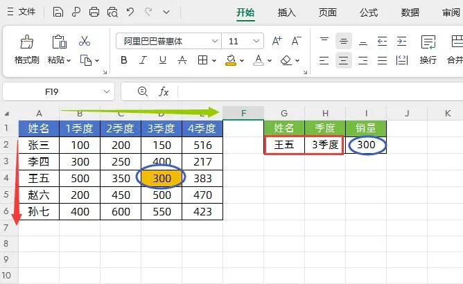 如下图所示,我们根据左侧表格中的纵向【姓名】和横向【季度】来查找最终的销售额,一个是纵横的,一个是横向的,也就是交叉查询。