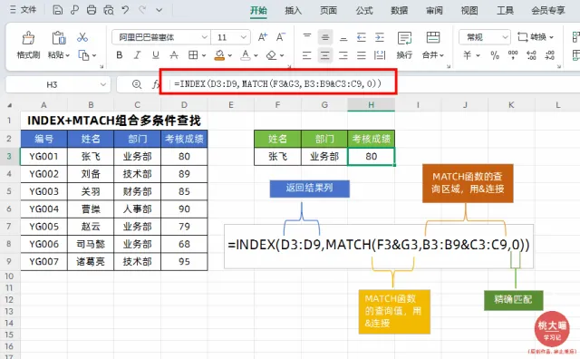 上面公式首先通过MATCH(F3&G3,B3:B9&C3:C9,0)获取查询值所在行号,然后再通过INDEX函数去结果列里面,找对应这个行的值。