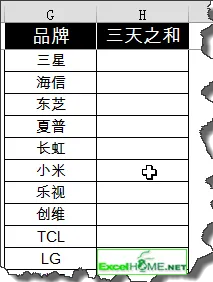 现在需要根据G列的品牌,计算其三天的销售总和。
