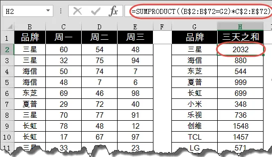 首先使用B$2:B$72=G2判断B列是否等于指定的品牌,得到逻辑值TRUE或是FLASE,再用逻辑值与C2:E72的数值相乘,最后使用SUMPRODUCT计算出乘积之和。