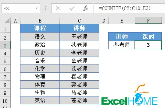 如下图所示,需要根据E3单元格的讲师姓名,在信息表中计算该老师的课时数,也就是一共出现了几次。