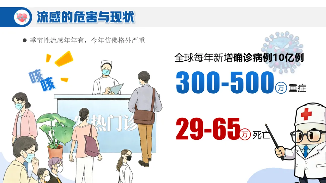 季节性流感年年发生,但今年尤其不容忽视。全球每年新增流感确诊病例约10亿例,其中重症高危人群如儿童、老年人及慢性病患者,容易并发病毒性肺炎,甚至危及生命。数据显示,每年因流感相关疾病死亡人数约在300-500万之间,我们必须提高警惕。
