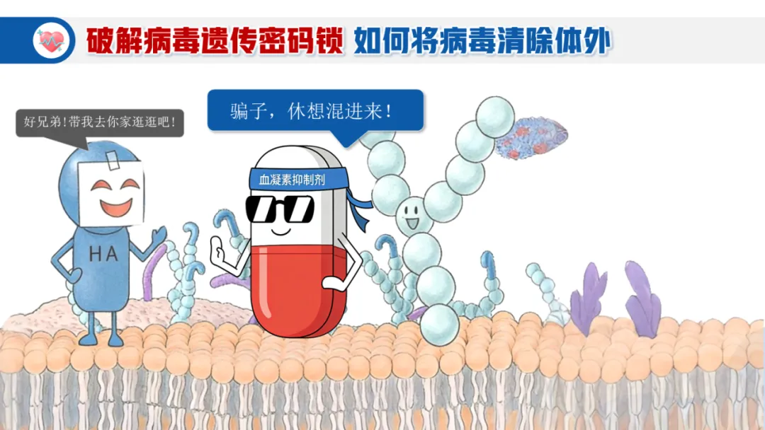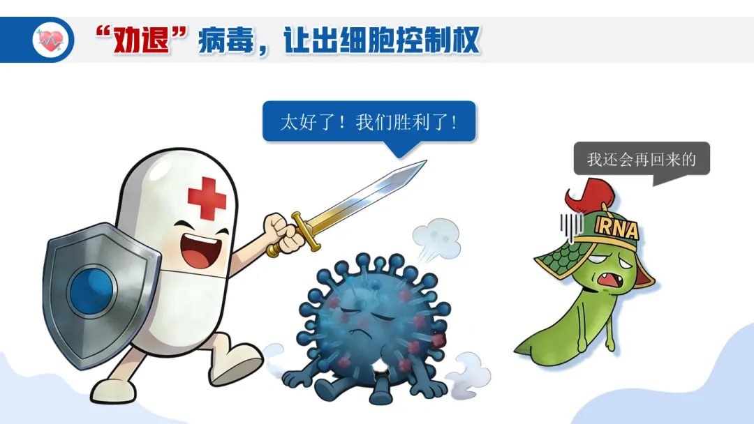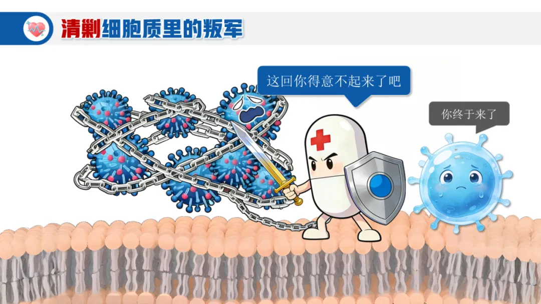 药物通过“破解病毒遗传密码锁”,阻止病毒进入细胞核,并在细胞质中清除病毒成分,最终实现“清剿叛军”,恢复机体健康。
