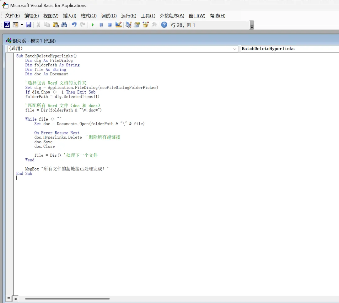 2、在VBA编辑器里按F5,然后回到Word,按【Alt + F8】选择刚刚生成的宏,点击【运行】,然后选择指定文件夹。它就会自动帮你清理该文件夹下所有Word中的超链接。