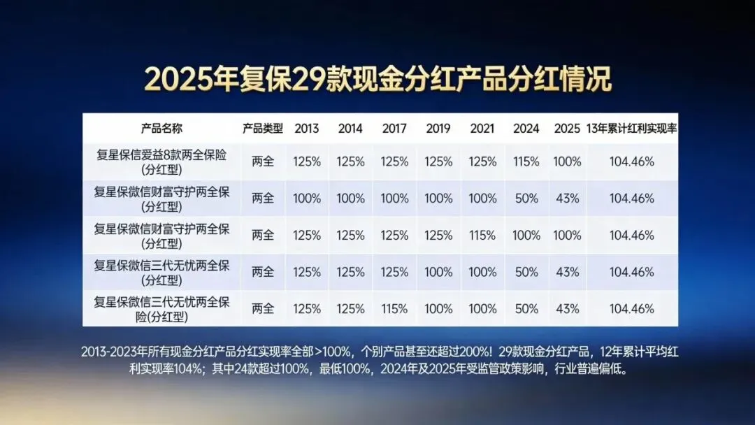 现金分红产品是复星保德信的核心分红险种,此次纳入统计的29款产品覆盖两全保险、年金保险等多种类型,时间跨度从2013年延伸至2025年,数据极具参考价值。