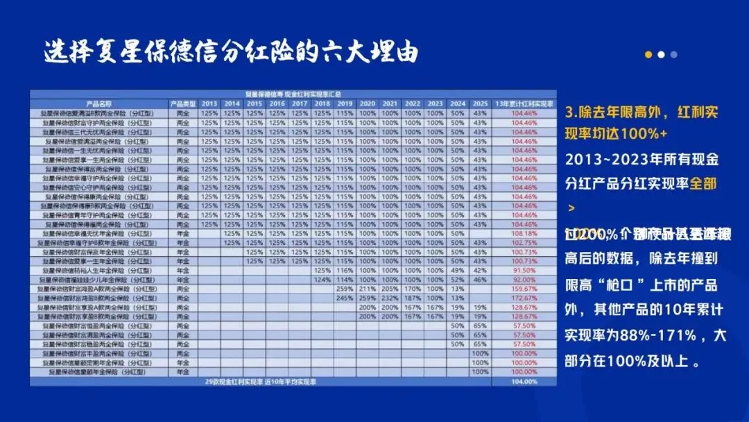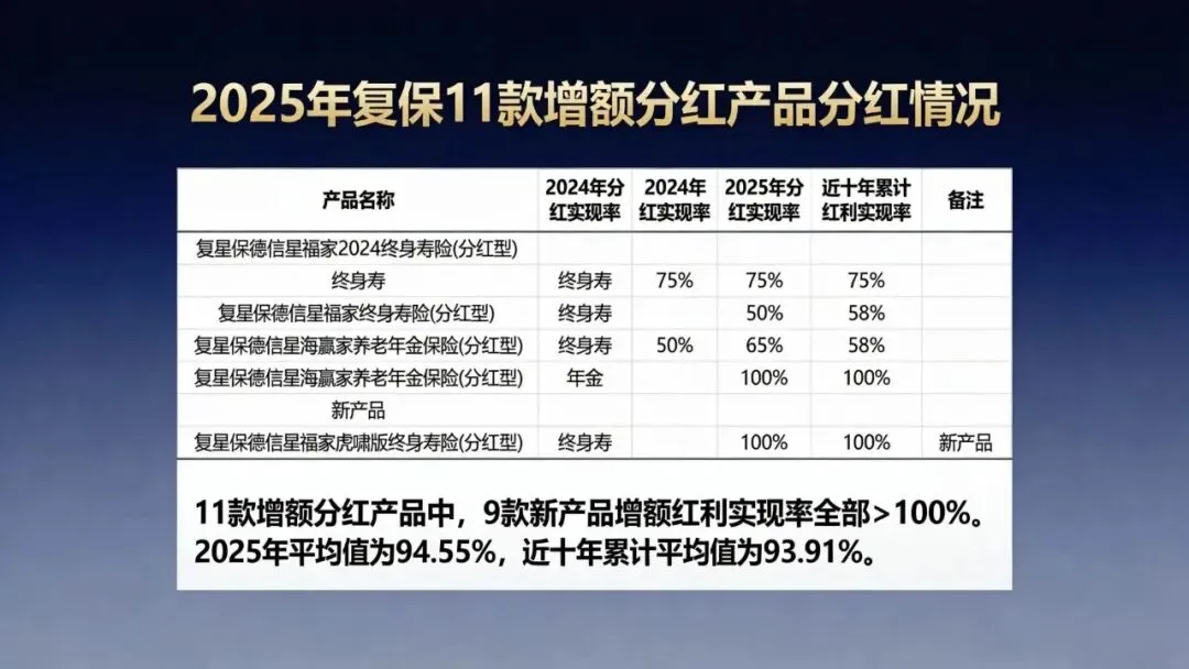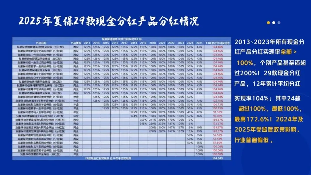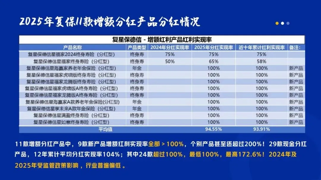 其中最值得关注的是9款新产品,包括复星保德信星海赢家养老年金保险(分红型)、星福家虎啸版、龙腾版系列终身寿险(分红型)等,这些产品2025年的增额红利实现率全部达到100%,累计实现率也均为100%。这意味着新产品完全兑现了分红承诺,给新客户吃下了一颗定心丸。