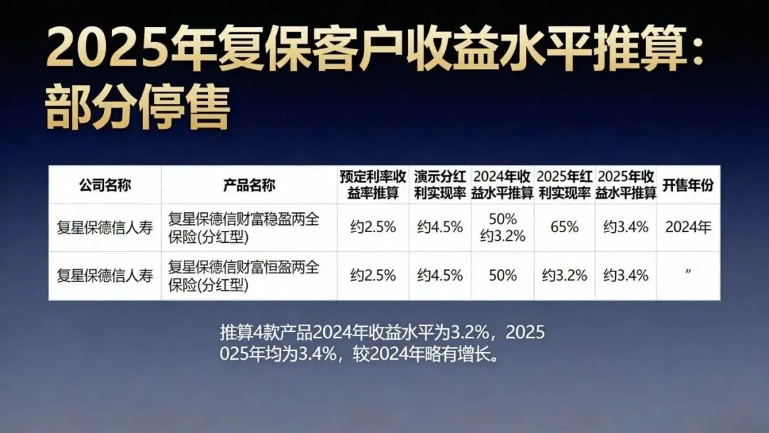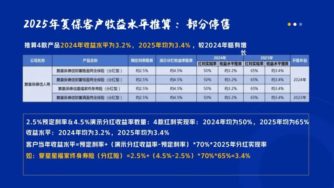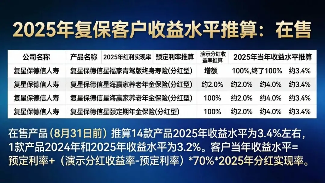 对于2025年8月31日前在售的14款产品,比如复星保德信星福家青版终身寿险(分红型)、星海赢家养老年金保险(分红型)等,报告测算其2025年收益水平约为3.4%。