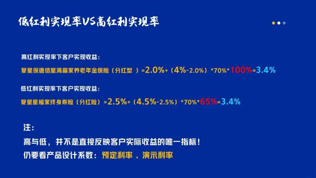 这里给大家一个重要提示:不能单纯用红利实现率的高低来判断实际收益。从报告的测算案例就能看出,高红利实现率(如100%)和较低红利实现率(如65%)的产品,最终实际收益可能相同(均为3.4%)。核心原因在于产品设计系数的差异,比如预定利率、演示分红收益率的不同。因此,挑选分红险时,不能只看单一指标,要结合产品的整体设计和公司的长期实力综合判断。