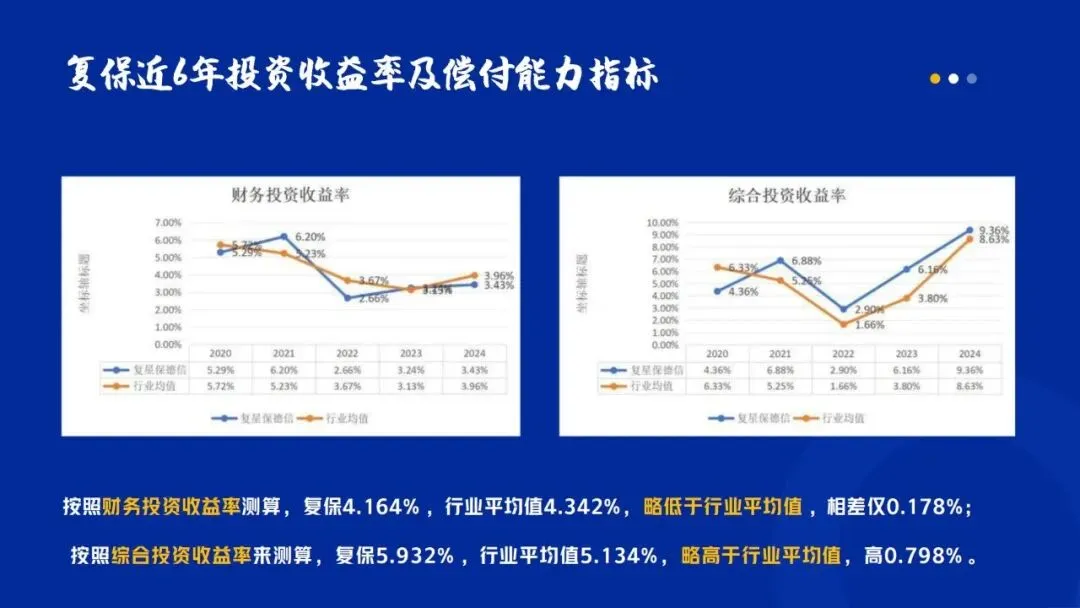从行业排名来看,复星保德信过去5年平均综合投资收益率在90家寿险公司中排名第20位,处于行业中上游水平;财务投资收益率排名第47位。需要说明的是,财务投资收益率对短期分红更有参考价值,而综合投资收益率包含浮亏浮盈,更能反映长期分红能力,这也体现了复星保德信在长期投资领域的优势。