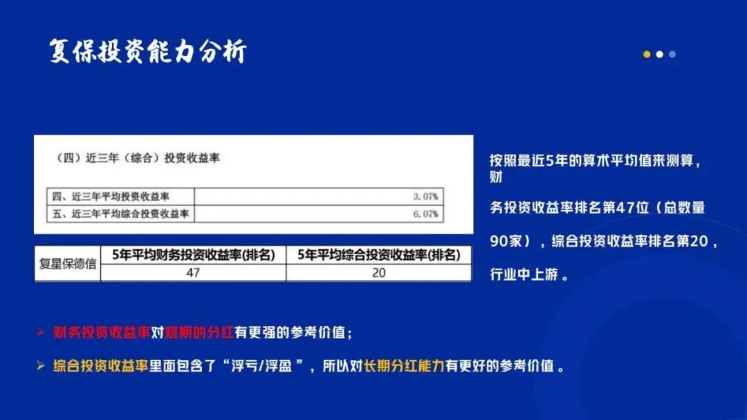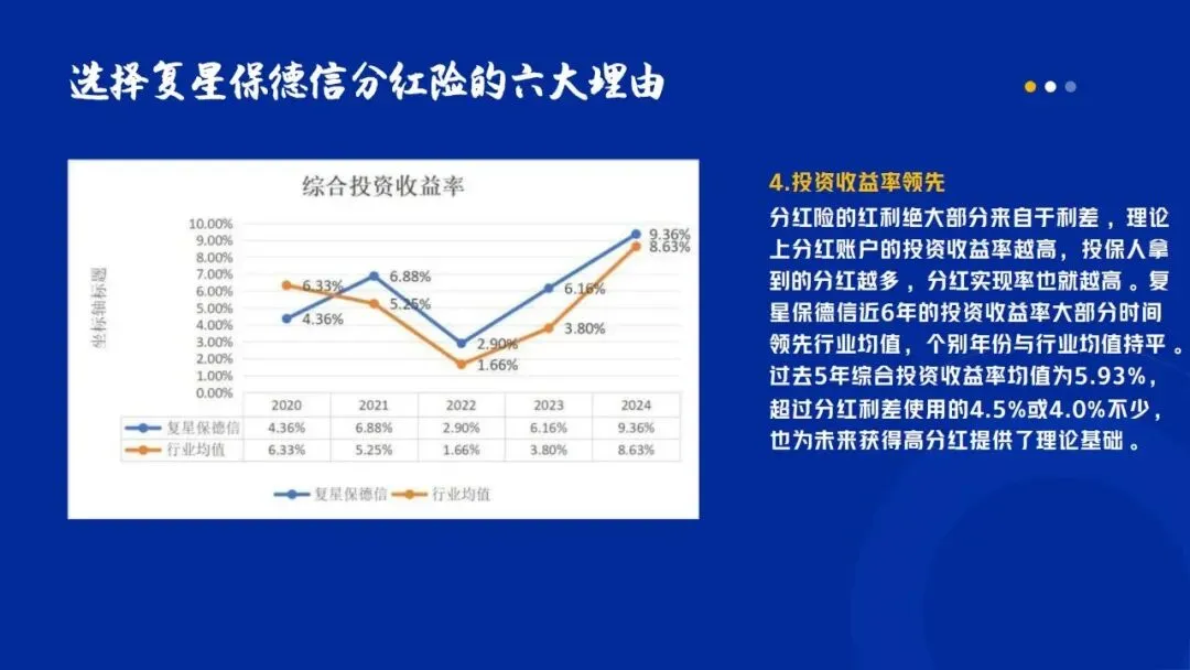 分红险的红利主要来自于保险公司的投资收益(利差益),投资能力越强,分红的“钱袋子”就越鼓。复星保德信近3年平均综合投资收益率达到6.07%,过去5年综合投资收益率均值为5.93%,超过了分红利差计算中使用的4.5%或4.0%,为未来的高分红提供了坚实的资金支撑。