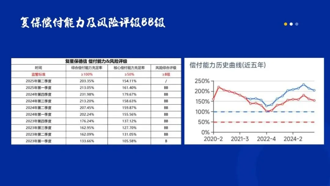 复星保德信的偿付能力表现十分稳健:2025年第二季度综合偿付能力充足率为203.35%,核心偿付能力充足率为154.11%,远超监管标准;从2023年第一季度至2024年第四季度,连续9次风险综合评级达到BB级,处于行业较好水平。充足的偿付能力,为分红险的红利兑现提供了安全保障,让投保人的资金更安心。