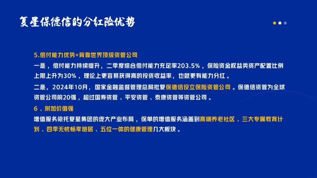 此外,随着监管政策的调整,保险资金权益类资产配置比例上限上升至30%,复星保德信凭借强大的资管实力,有望在权益市场获得更高的投资收益,进一步提升分红能力。
