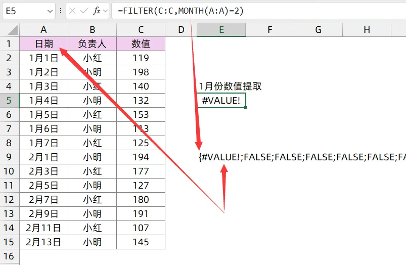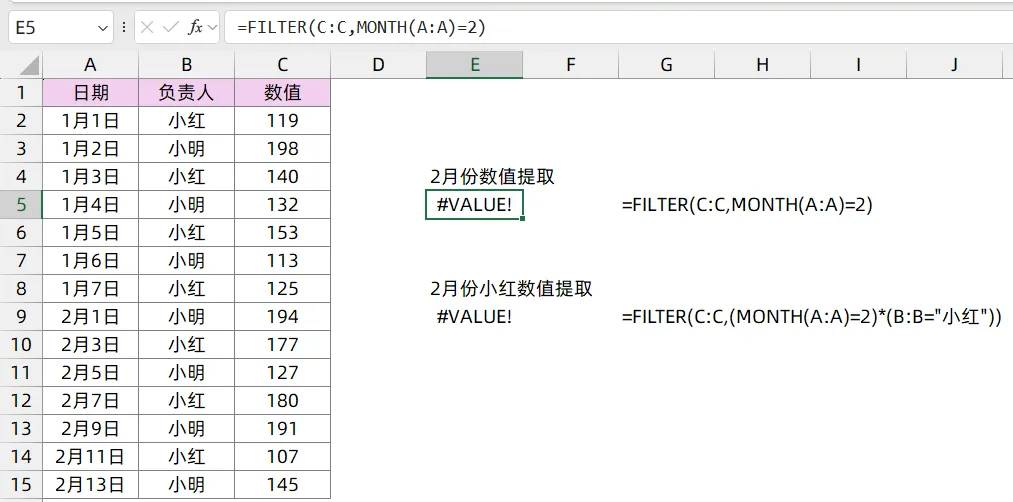=FILTER(C:C,(MONTH(A:A)=2)*(B:B="小红"))