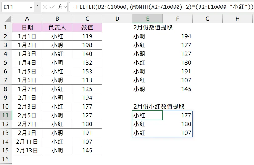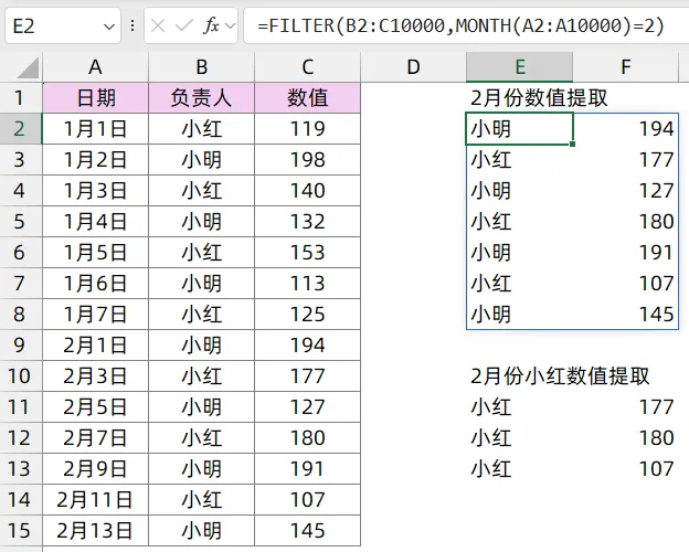 =FILTER(B2:C10000,(MONTH(A2:A10000)=2)*(B2:B10000="小红"))