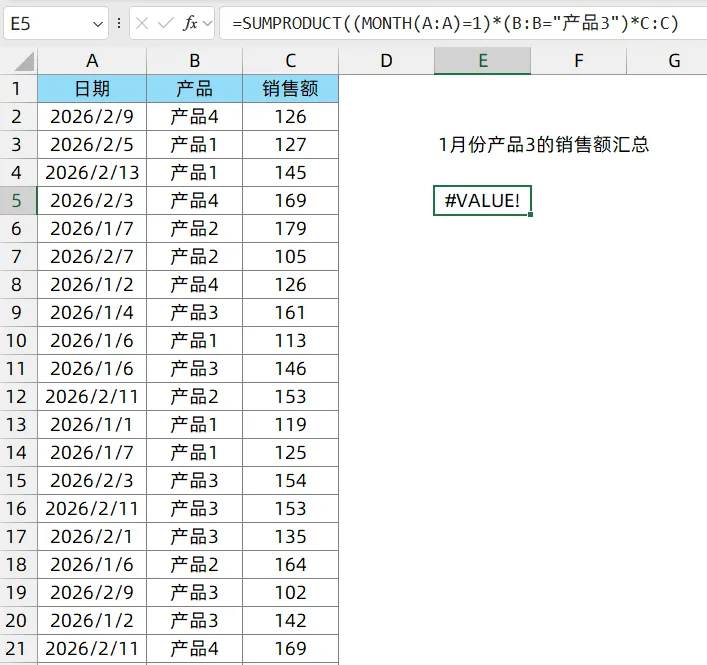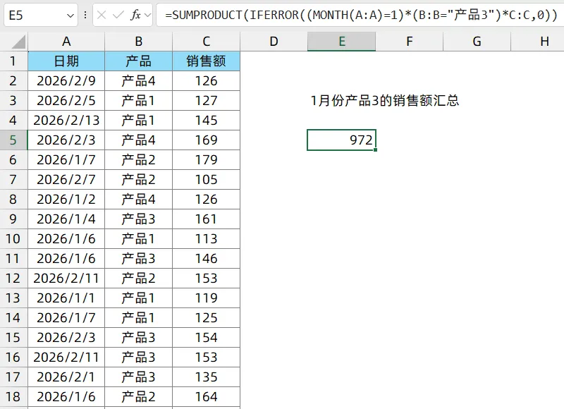 =SUMPRODUCT(IFERROR((MONTH(A:A)=1)*(B:B="产品3")*C:C,0))