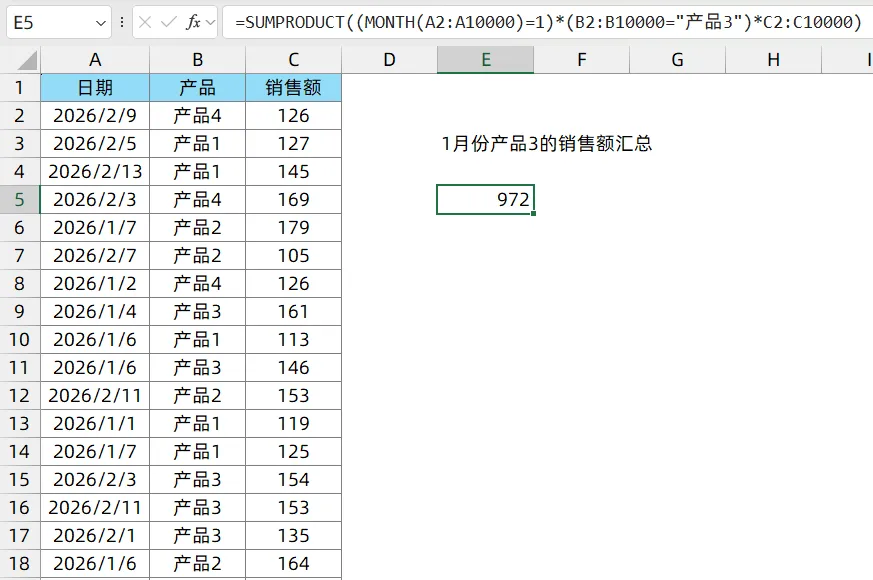 =SUMPRODUCT((MONTH(A2:A10000)=1)*(B2:B10000="产品3")*C2:C10000)