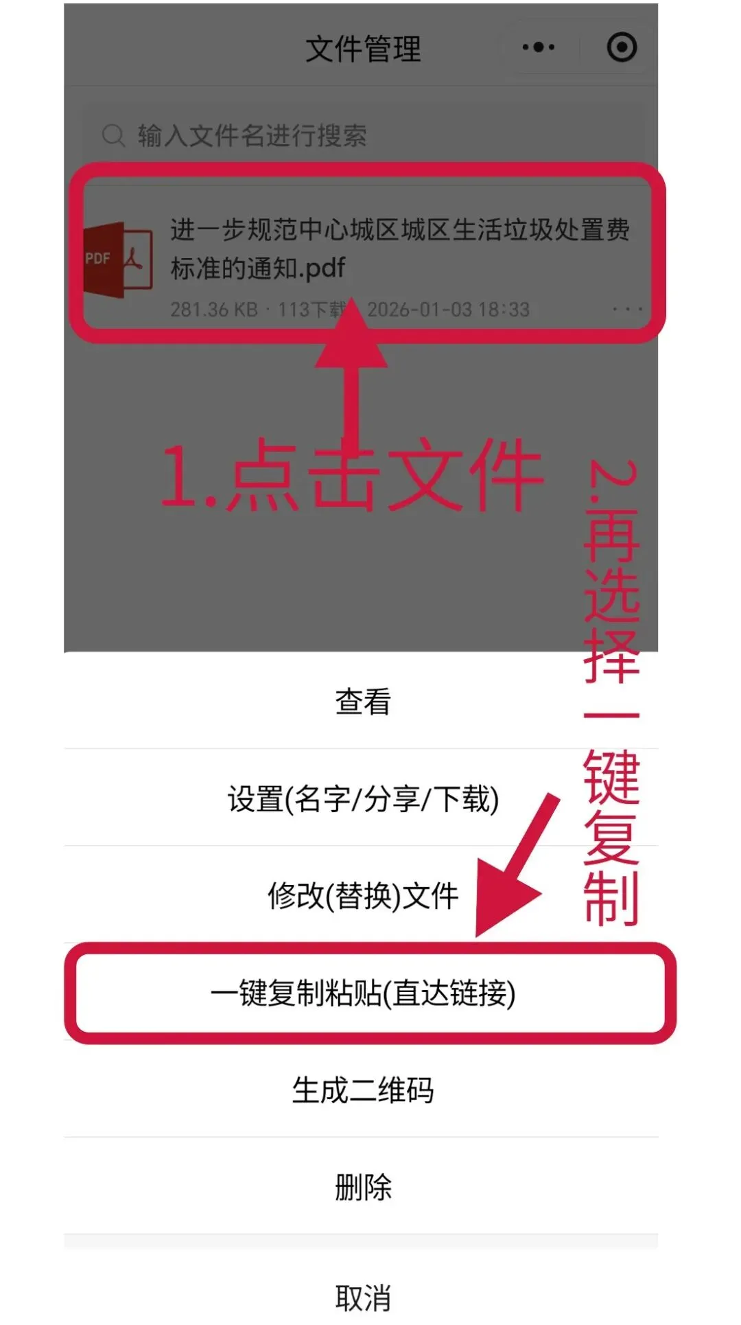 3. 上传成功后,进入【文件管理】,点击该文件,选择【一键复制粘贴】,复制链接