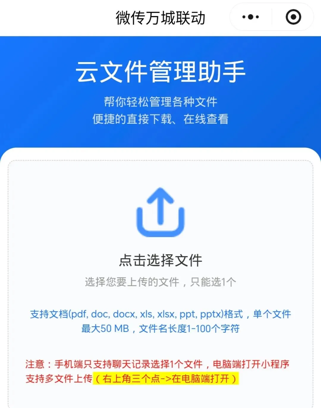 小程序→微传万城联动(微信小程序,全国通用,支持多文件格式)