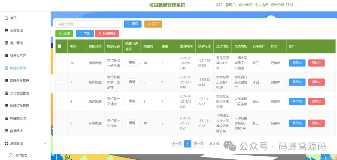 校园跑腿管理系统的重要核心功能用户管理、跑腿员、发布跑腿单、跑腿单抢单、管理跑腿订单、跑腿单评论、数据统计等。具体功能模块如下: