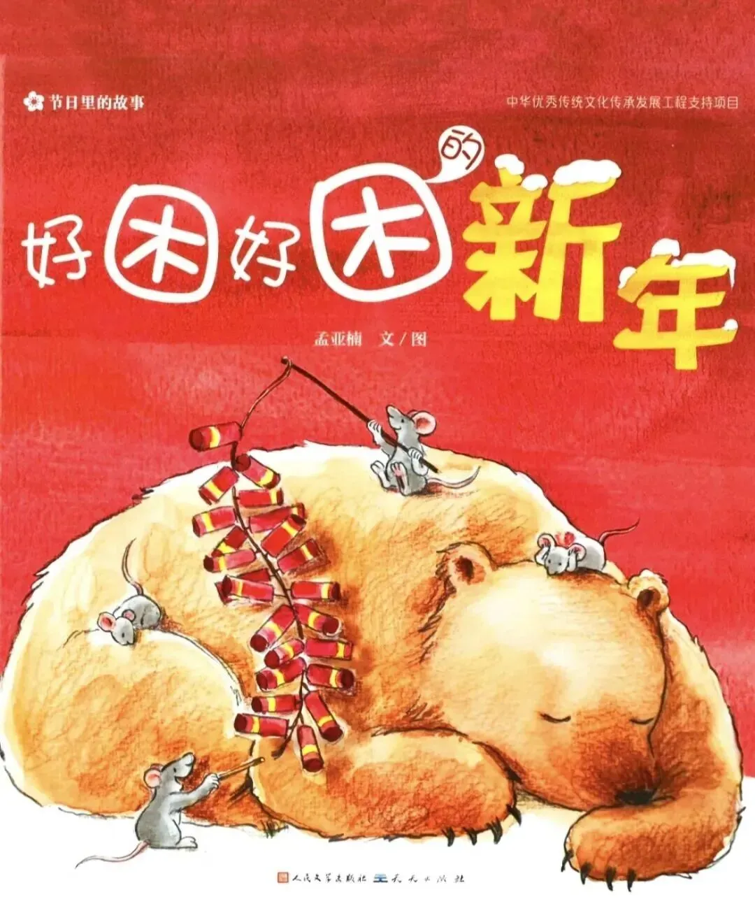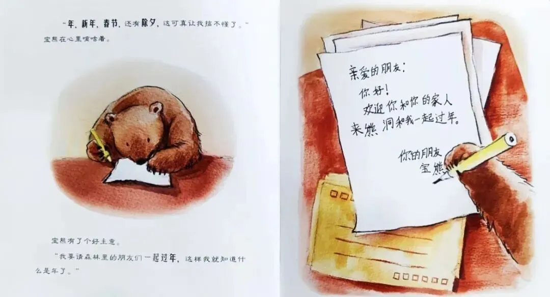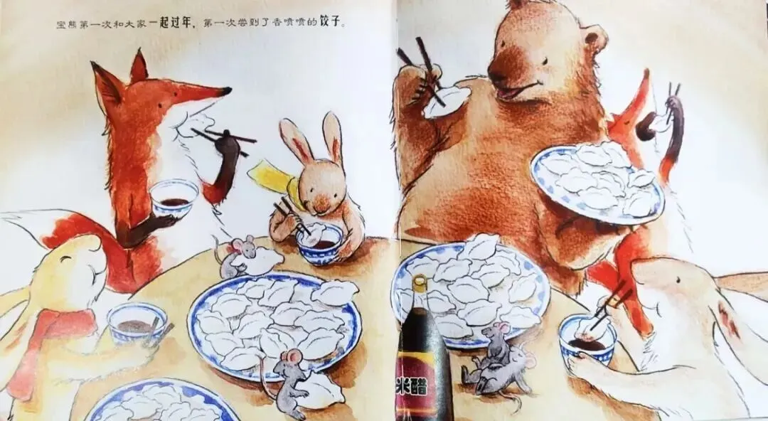 主角宝熊每年冬天都在冬眠,从没体验过新年。今年它决定不冬眠,写信邀请狐狸、兔子、老鼠等朋友到熊洞一起过年。大家一起贴春联、挂灯笼、剪窗花、包饺子、煮饺子,还敲锣打鼓、放烟花,热闹非凡。宝熊一边参与一边和困意斗争,最终在朋友们的陪伴下,尝到了饺子的香味,感受了新年的温暖与欢乐。故事以童趣视角展现春节习俗,传递团圆与分享的意义,水彩画风柔和温暖。