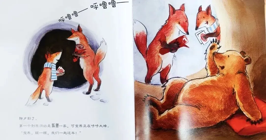 第一个到熊洞的是狐狸一家,可宝熊正在呼呼大睡。