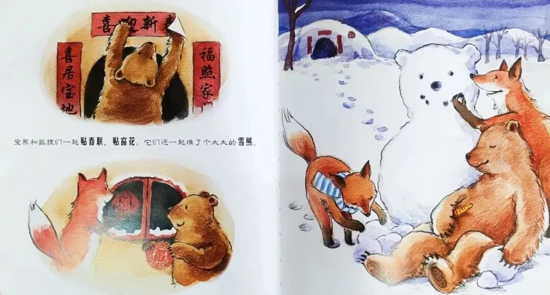 宝熊和狐狸们一起贴春联、贴窗花。它们还一起堆了个大大的雪熊。第二个到熊洞的是老鼠一家,可是宝熊又睡着了。