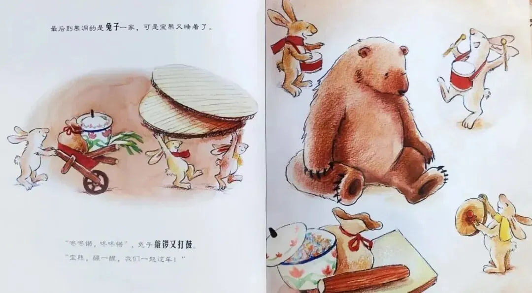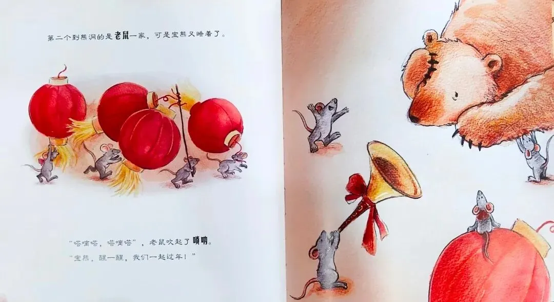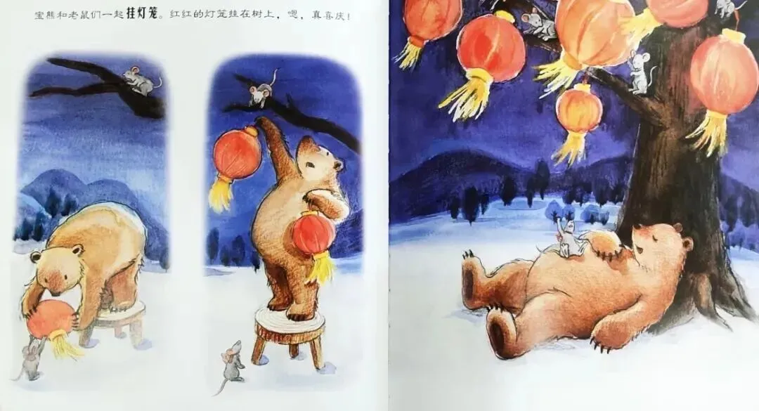 宝熊和老鼠们一起挂灯笼。红红的灯笼挂在树上,嗯,真喜庆!最后到熊洞的是兔子一家,可是宝熊又睡着了。